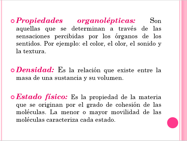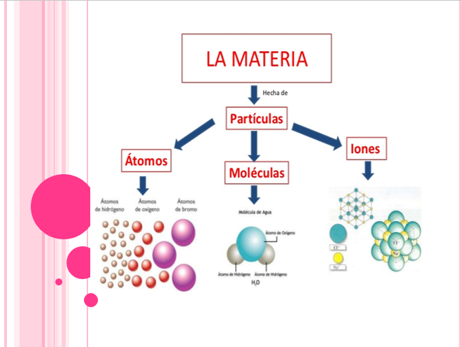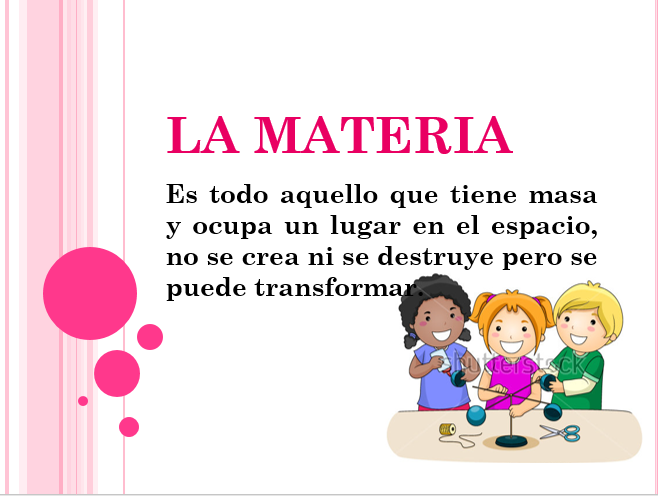 La amistad de tus compañeros, el color de los ojos o la simpatía de tu amigo son cosas inmateriales, que no puedes ver o tocar. Por otro lado estás rodeado de cosas que puedes ver: tus propios compañeros, las sillas y pupitres del aula, la pizarra, etc. Otras, aunque no puedas verlas, puedes oírlas, como los coches y motocicletas que pasan por la calle. Algunas, incluso sin verlas u oírlas, las sientes, como el aire. Todas las cosas que puedes ver, oír, tocar están formadas por materia. Podemos decir que materia es todo aquello que podemos percibir por nuestros sentidos.